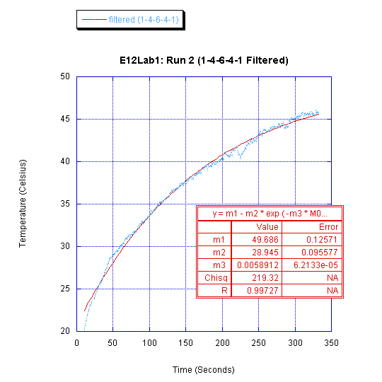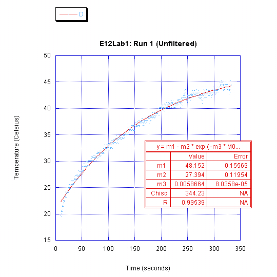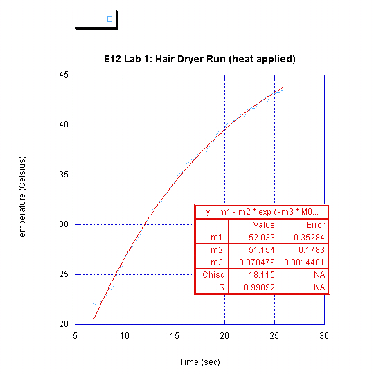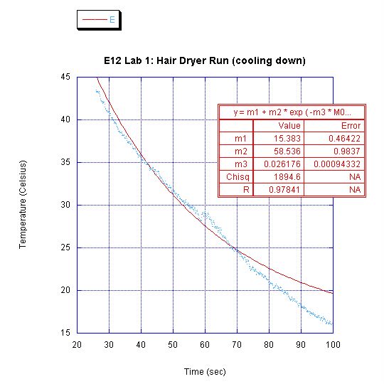 It is clear from the acquired data that heating the box with the hair dryer did indeed result in an exponential curve, however the cooling process doesn't seem at all to fit an exponential. The only explanation we can think of is that we did something horribly wrong with the cooling down process.