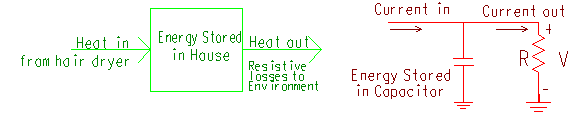 The thermal capacitance of the insulated box is analogous to the capacitor in the circuit, as it is capable of holding some heat, while the capacitor holds charge. Thus, heat and charge are analogous quantities also. As the charge builds up in the capacitor up to the maximum capacity, the heat also builds up in the box up to the maximum heat until the thermal resistance allows the heat to leave at the same rate that it enters.