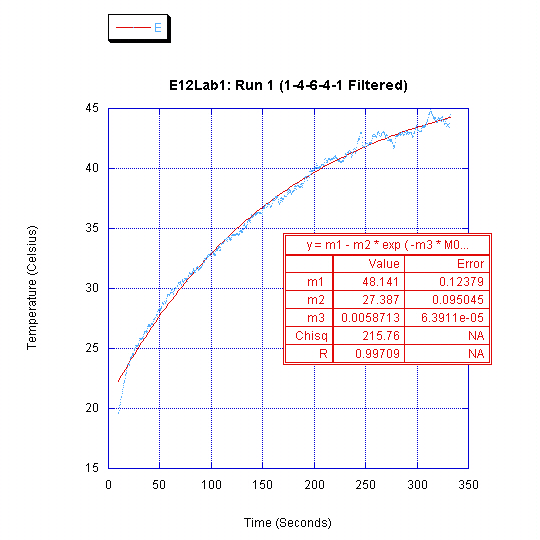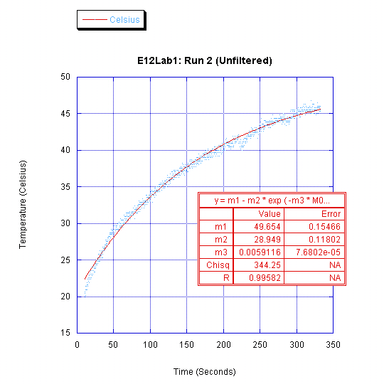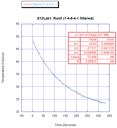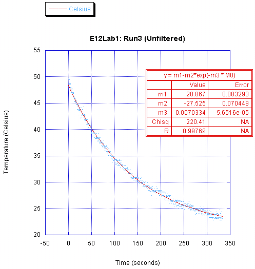 The time constant values obtained (between 140-170 seconds for the various runs) accurately describe the amount of time required for the exponential fit to decay to 67% of its initial value. This is analogous to the time constant work we did with first order electrical circuits in previous labs.
