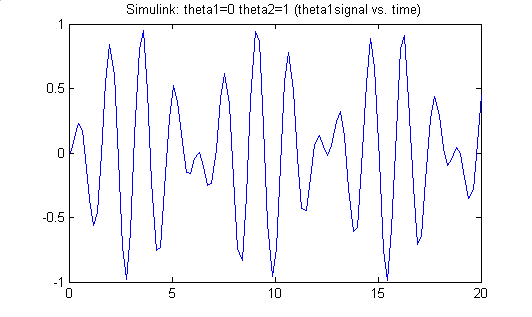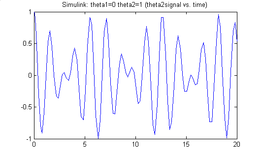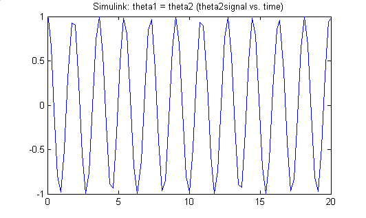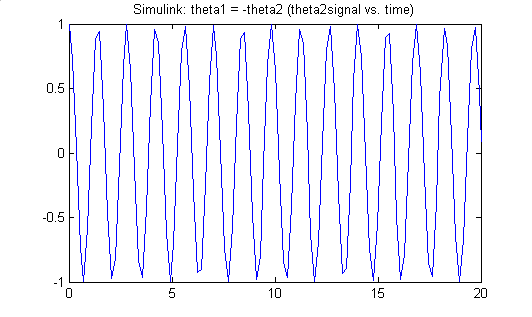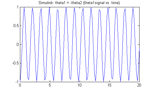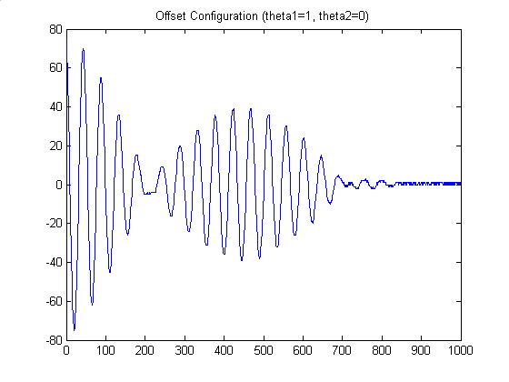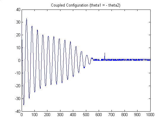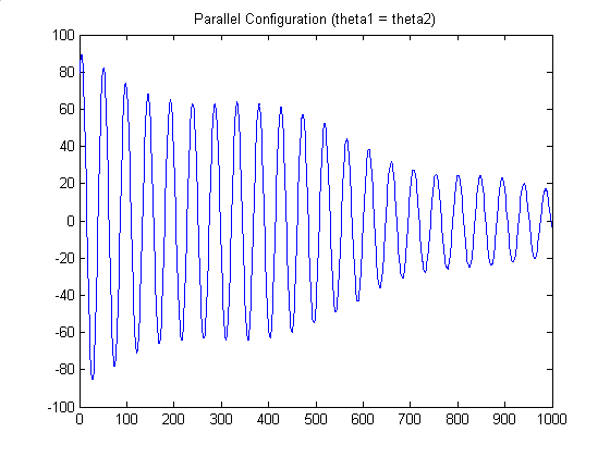 Overall, our actual results from the pendulum matched the theoretical results obtained using Simulink relatively well. For the parallel offset of the two masses, both the theoretical and actual results showed that the masses would move in a periodic motion similar to each mass moving on its own. This makes sense because when the two masses are offset by the same amount in the same direction, the spring will have no effect on the motion of the system. For the coupled offset of the two masses, both the theoretical and actual results showed that the pendulums would again move in a periodic manor, but that the frequency of oscillation would be higher than for the parallel offset. This again makes sense because as the two masses move away from each other the spring stretches and pulls them back towards each other. However, when they move towards each other the spring contracts and pushes both the masses away. This additional force on the masses causes the frequency of oscillation to increase which is shown in both the theoretical and actual results. Again both the theoretical and actual results show that when only one of the masses is offset, the resulting motion is a combination the parallel and coupled motions. However, there was one major difference between the theoretical and actual results. The theoretical results show the amplitudes of the oscillations as constant while the amplitudes of the actual result decrease over time. This discrepancy is the result of damping in the real pendulum system that is not accounted for in the theoretical model.