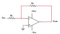 The manufacturer's slew rate specification for the LM411 is 15 Volts / usec. With a feedback resistor of 30 k, the voltage transition from +10V to -10V took 960ns, giving a slew rate of 20V/0.96usec = 20.83. Using a 10k feedback resistor, the slew rate was measured to be 10/1.44 = 6.94 V/usec. The input resistor in both cases was 10k. This data is interesting because it seems reasonable that since the slew rate is the ratio of the voltage drop to the time required for the transition, the slew rate should be independent of the gain. For the -3 gain circuit, the slew rate was far higher than for the circuit of -1 gain. This is probably due to the point at which the time measurements were made for the smaller gain circuit. Looking at the oscilloscope printout, the circuit overshot the target voltage of -5 V on the transition and oscillated slightly before stabilizing at -5V. Our measurement was taken from the start of the transition to where the output voltage appeared stable. Had we measured to the minimum peak voltage value, the time would have been about 0.7 usec, resulting in a slew rate of 14.28 V/usec, which is in much greater accordance with the manufacturer's specification.