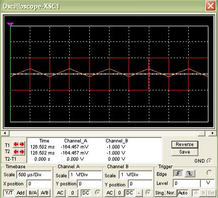 The input in the time domain (f(t)) is a unit step. Taking the Laplace transform, F(s) = 1/s. The transfer function for the circuit (G(s)) is -1/(sR2C1). The output function in the frequency domain is found by multiplying F(s) and G(s), giving -1/(s2R2C1). Taking the inverse laplace transform, the output function in the time domain is found to be G(t) = -t/(R2C1). The step occurs over 500 us. R2 = 100k ohms and C1 = .01uF. Plugging in these values, the peak to peak amplitude of the triangle wave output is .5 V. This is confirmed by our scope printout and by our MultiSim simulation.