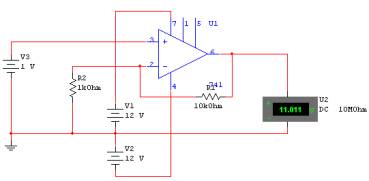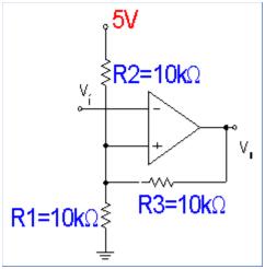 The comparator circuit implemented with an Op Amp operates by setting a threshold voltage using a voltage divider between Vcc and Gnd with resistors R1 and R2. Since Vcc in this case is 5V and R1=R2=10k, the V+ terminal of the Op Amp is at 2.5V. Since the Op Amp attempts to drive the two inputs to the same voltage, a voltage less than 2.5V at the V- terminal will cause the Op Amp output voltage to saturate at positive supply rail since there is no feedback resistance. If V- is greater than 2.5, the output voltage saturates at the opposite supply rail.