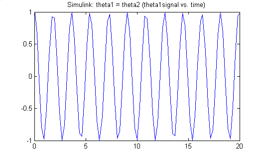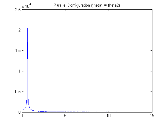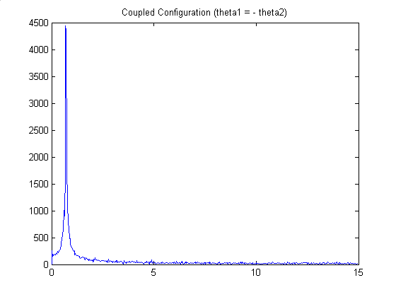 Overall, our actual results from the pendulum matched the theoretical results obtained using Simulink relatively well. For the parallel offset of the two masses, both the theoretical and actual results showed that the masses would move in a periodic motion similar to each mass moving on its own. This makes sense because when the two masses are offset by the same amount in the same direction, the spring will have no effect on the motion of the system. For the coupled offset of the two masses, both the theoretical and actual results showed that the pendulums would again move in a periodic manor, but that the frequency of oscillation would be higher than for the parallel offset. This again makes sense because as the two masses move away from each other the spring stretches and pulls them back towards each other. However, when they move towards each other the spring contracts and pushes both the masses away. This additional force on the masses causes the frequency of oscillation to increase which is shown in both the theoretical and actual results. Again both the theoretical and actual results show that when only one of the masses is offset, the resulting motion is a combination the parallel and coupled motions. However, there was one major difference between the theoretical and actual results. The theoretical results show the amplitudes of the oscillations as constant while the amplitudes of the actual result decrease over time. This discrepancy is the result of damping in the real pendulum system that is not accounted for in the theoretical model.