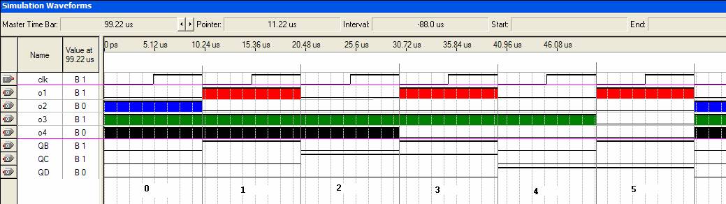 When the outputs are high, the corresponding color is filled in on the waveform below. A quick check when the counter outputs the value 2 indicates that the circuit is operating correctly.