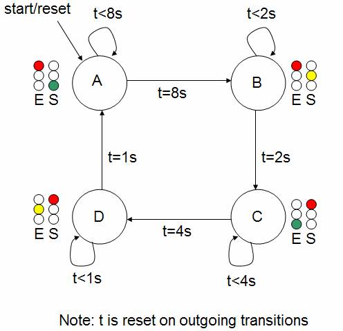 We implemented a state machine to control two traffic lights at an intersection. It was assumed that the North-South road generally had heavier traffic, so longer delays were used for that direction. The state diagram is shown below.