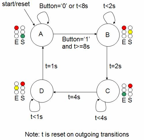 Since the North-South route was significantly busier, the state machine was modified so that the N-S light would be green unless a button was pressed, at which point the state machine would progress to the sequence where the East-West light turns green. However, the state machine ensures that the North-South light is on for at least 8 seconds, so that a new car approaching the E-W intersection will not immediately cause the state machine to advance, which could potentially result in the N-S light never staying green for an adequate amount of time. The new state transition diagram is given below.