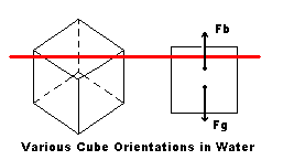 Cubes of various materials with specific weights less than that of water will float in different orientations due to the aforedescribed reasons. Depending on the density of the cube relative to water, more or less of the cube’s volume will float above the waterline. In order to keep the center of gravity below the buoyant force, the cube may float in either of the orientations depicted above. For cubes with specific weights closer to that of water, the 2nd orientation in the figure was observed. This is the "expected" orientation. Cubes with specific weights approximately half that of water floated with most of the volume below the waterline, as shown in the 1st orientation, with a pyramidal extrusion above the water line. Icebergs in the ocean float in the same fashion, with most of their mass underwater and only a small portion above.