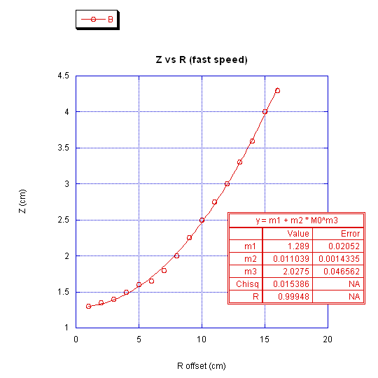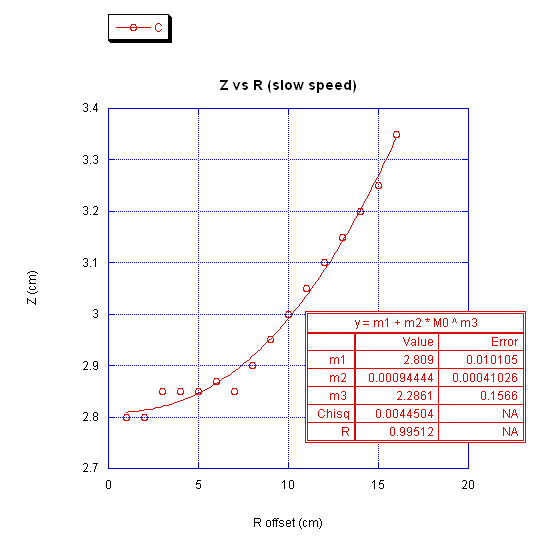 Plugging in the values r = 9 cm and z = 2.95 cm from the slow rotation, and taking z0 to be 2.809 cm, we get from the theoretical model that
