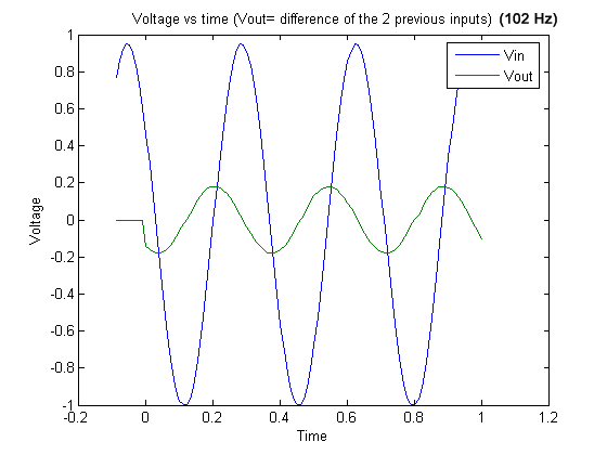 Graph 24 . 102 Hz signal and output (difference of the two previous inputs).