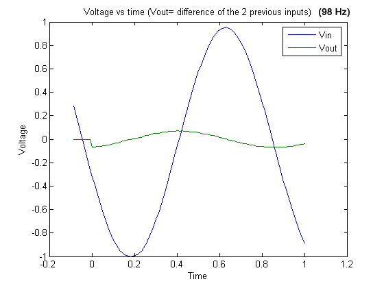 Graph 23 . 98 Hz signal and output (difference of the two previous inputs).