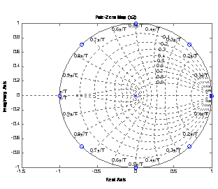 The lines made by the ‘zgrid’ command can be grouped into two categories. The lines labeled 0.1 … 0.9 indicate the damping factor of the system. Near the unit circle, the damping factor is very small, which suggests a highly oscillatory system. When the damping factor is unity, the poles are purely real, so no oscillation will result. The other lines indicate the natural frequency in terms of the sampling period T. This is because the frequency axis maps to the unit circle in the z-domain. Zero frequency is found at z = 1.