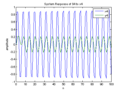 In the third graph (x3), we see complete attenuation once the filter receives the required 8 samples to function. However, for a higher frequency input (x4) the filter fails to attenuate due to the side lobes of the filter response, and we observe incomplete attenuation of the input signal.