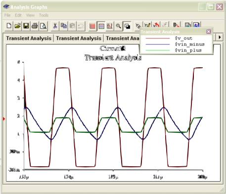 The relaxation oscillator is essentially a Schmitt trigger circuit with the Vin terminal connected to a resistor R3 and a capacitor C. The RC combination ensures that the voltage at the Vin terminal cannot change instantaneously, meaning that it takes time for Vin to transition across the threshold voltage set at the V+ terminal. The analysis graph above shows clearly the Schmitt trigger-like transitions of the V+ threshold voltage (green). Refer to the explanation of the Schmitt trigger circuit for an explanation. When the V+ terminal changes from the low voltage state (~1.2V) to the high voltage state (~2V), the voltage across the R3 resistor changes, causing more current to flow through it. Since the voltage across the capacitor cannot change instantaneously, the capacitor 'fills up' with the time constant defined by RC in theory until no current flows through it (stable state). However, before it reaches a stable state, the voltage at the V- terminal of the capacitor will pass the threshold voltage for the Schmitt trigger, and the V+ voltage and thus the threshold voltage will drop again. Since the state is now V+ < V-, the voltage at the output is 0, causing the capacitor to discharge with the same RC time constant. As soon as the voltage across the capacitor drops below the lower threshold voltage, the Schmitt trigger flips, and the process repeats.