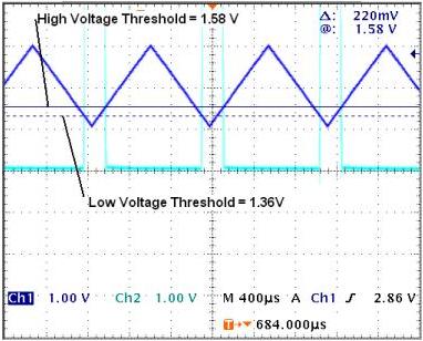 The measured time per transition from the above oscilloscope image shows a period of about ~6 uSec. The calculated period was 8.06x10^-6, or ~8 uSec. The theoretical and measured periods are essentially the same, and the variation in the experimentally obtained value could easily be a result of resistor tolerances.