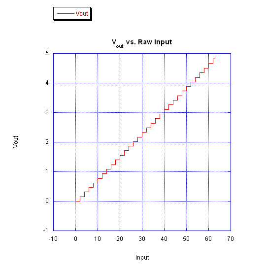 The circuit was verified by changing the port C value through the PIC web interface, and recording the output voltage. The input ranged from 0 to 63 with an increment of 2. The results are catalogued below: