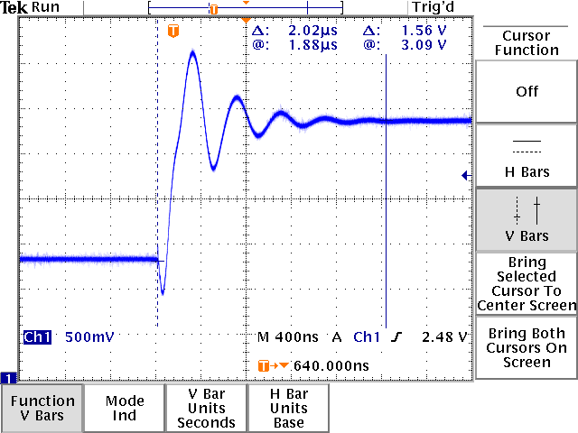 The oscilloscope output clearly shows the transition period between the two voltages. The voltage seems to have a 2nd order underdamped resonance instead of a linear ramp or 1st order response. The settling time was measured with the cursors to be approximately 2.02 us for a transition from 1.55 volts to 3.10 volts. This compares unfavorably with the settling time documented in the datasheet, which claims a settling time of 150 ns in the worst case when all the bits are switched on to within ±˝ LSB. However, the datasheet also mentions that board layout, short leads, 100 uF supply bypassing, and minimum scope lead lengths are mandatory for satisfactory settling time measurements. None of these were taken into consideration in the lab, which could explain at least in part the much larger observed settling time.