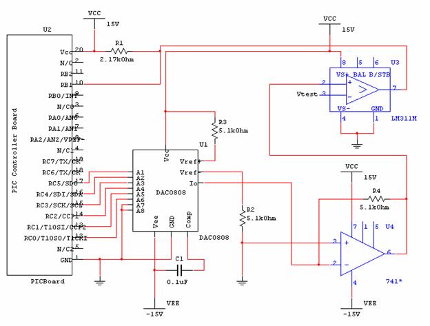 The LM311 was used with the non-inverting input connected to the D/A and the inverting terminal connected directly to the test voltage. The comparator was powered by a +15 V supply, to ensure reliable comparisons. Using a 5 V supply gave unstable results when the D/A output voltage (and the test voltage) neared 5 V. The comparator output was pulled up to a +5 V reference through a 2.1k resistor to provide the standard 0-5V logic levels to be read by the PIC. The comparator output was connected to input pin RB1 (pin 4 on the PIC board). The schematic of the circuit is given below.