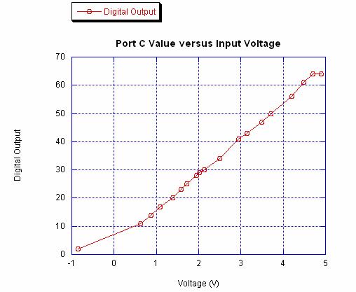 The minimum digital output was 2. There was a fairly linear relationship with the input and output as the test voltage input was increased. The maximum digital output achieved is 64. There was a slight plateau after the input reached 4.70 volts. As stated before, the discrepancies can be attributed to the granularity of the D/A ramp. Plotting the data: