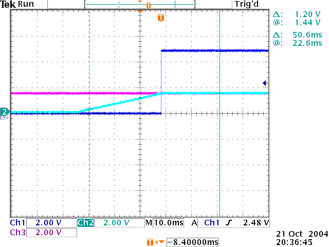 The following oscilloscope output displays the test voltage (pink line), the value of port c (turquoise line), and the value of pin b1 (dark blue line). The graph clearly shows how the voltage at port c increases until it is equal to the test voltage. Pin b1 then switches to high and the voltage at port c stops incrementing.