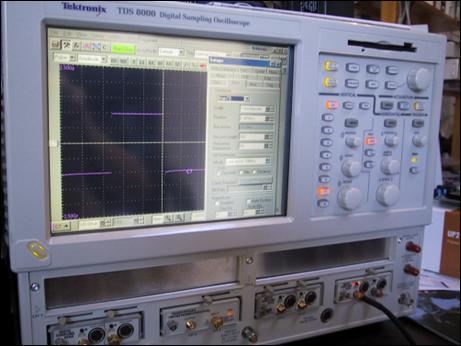The pulse generator on a Tektronix TDS 8000 20GHz digital sampling oscilloscope was used to generate a fast rise-time square pulse. An SMA test cable was attached with a T-connector to a Tektronix TDS 3052 500MHz scope to view the transmission line voltage. The test cable was approximately 2 m long. The instruments are shown below: