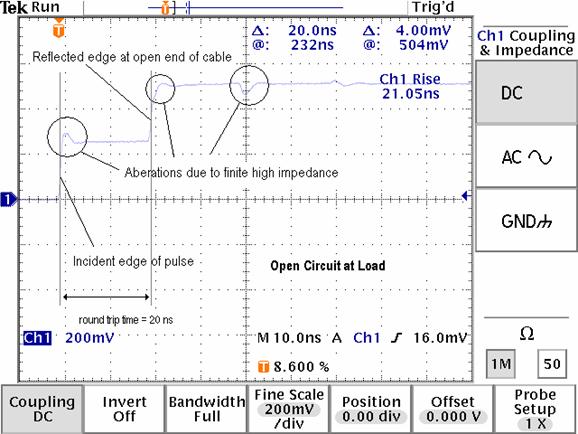 From the scope display the round trip time for the pulse and its reflection to arrive at the observer is measured to be 20 ns. Given the permeability and permittivity of the cable dielectric, the length of the cable can be determined. Likewise, given the cable length, the round trip time, and assuming a permeability of 1, the cable dielectric constant can be readily determined.