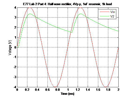 title('E77 Lab 2 Part 4: Half-wave rectifier, 4Vp-p, 1uF reservoir, 1k load');