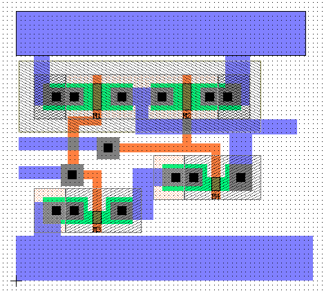 A more efficient implementation could be achieved by replacing the NAND2 gate based inverters with simple CMOS inverters. Since the cells have the same height, the Vdd and GND lines connect directly, and the output of one gate can be connected directly to the input of the next gate from left to right.