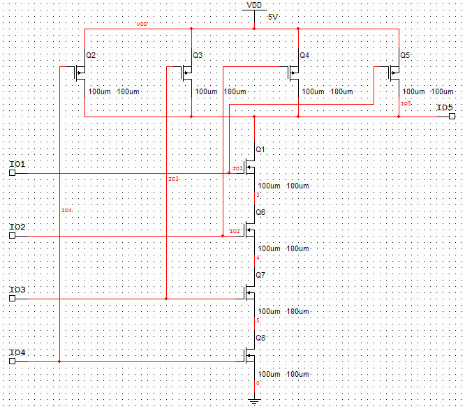 A custom design for a 4-input NAND analogous to the 2-input NAND gate can be achieved with the circuit above. The only way for the output (IO5) to be low is if all of IO1..4 are high, since that is the only way a current path is created from Vdd to ground. As a result the circuit functions correctly as a 4 input NAND gate. This approach requires only 8 transistors, while building the gate from smaller components requires a total of 3(4 nand2) +2(2 inverter) =16 transistors. The space savings with a good layout would be significant.